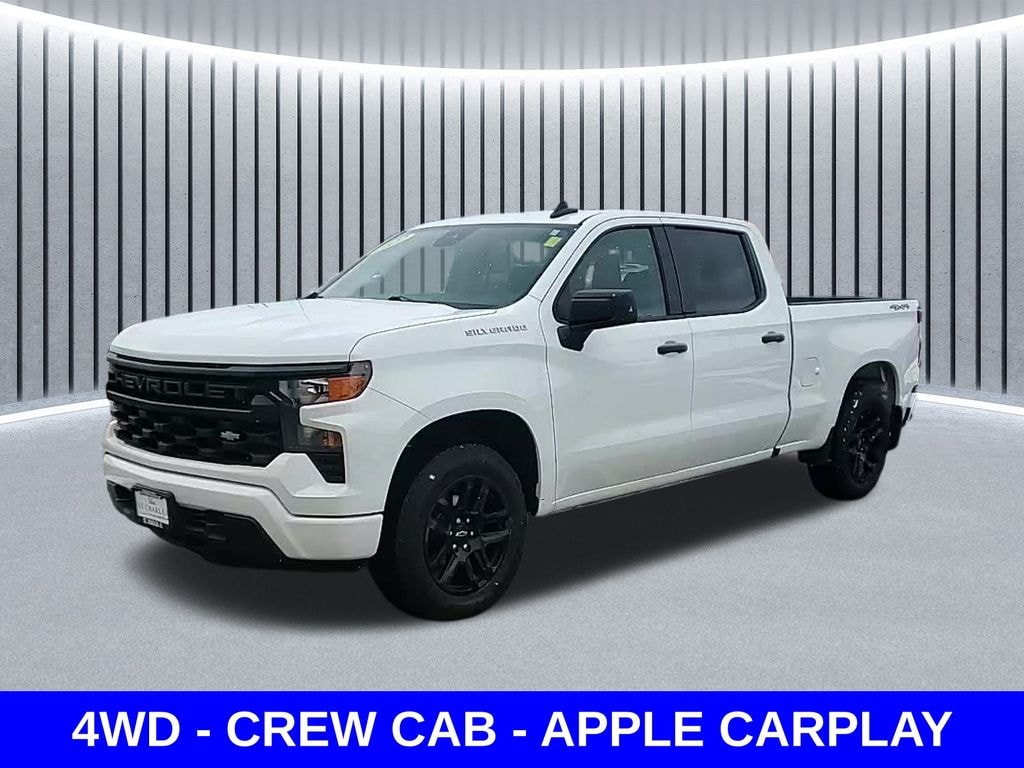 Odometer is 1419 miles below market average! ** Apple CarPlay/Android Auto, ** Blind Spot Monitor, ** Cross Traffic Alert, ** Alloy Wheels / Premium Wheels, ** Bluetooth, Hands Free, ** Brake Assist, ** Camera Backup, ** Chrome Wheels / Premium Wheels / Custome Whwels, ** Cruise Control, ** Keyless Entry, ** LED Headlights, ** Premium Sound System / Premium Audio, ** Stability Control, ** Steering Wheel Controls, ** Tow Hitch / Trailer Hitch, ** USB Port, CREW CAB, 4X4, 4WD, Horsepower: ~310 hp Torque: ~430 lb-ft Transmission: 8-speed automatic Drivetrain: 4WD ð' That torque number is the keyâ"430 lb-ft comes in low RPM, so it actually feels strong off the line and for towing, even though itâs a 4-cylinder. â½ Fuel Economy City/Highway: ~17 / 20 mpg Combined: ~18 mpg Pretty typical for a full-size 4x4 truckâ"slightly better than V8 options. ð» Capability Max towing: ~9,300 lbs Payload: ~2,000 lbs Seating: Up to 6 (bench seat), Silverado 1500 Custom 4WD CREW CAB, 4D Crew Cab, 2.7L Turbo, 8-Speed Automatic, 4WD, Summit White, Jet Black Cloth, 10-Way Power Driver Seat w/Lumbar, 120-Volt Instrument Panel Power Outlet, 3.5" Monochromatic Display Driver Info Center, Bluetooth® For Phone, Color-Keyed Carpeting Floor Covering, Compass, Custom Convenience Package, Custom Value Package, Deep-Tinted Glass, Dual Rear USB Ports (Charge Only), Electric Rear-Window Defogger, Electrical Steering Column Lock, Electronic Cruise Control, EZ Lift Power Lock & Release Tailgate, Front Frame-Mounted Black Recovery Hooks, Front Rubberized Vinyl Floor Mats, HD Rear Vision Camera, High Capacity Suspension Package, LED Cargo Area Lighting, Manual Tilt Wheel Steering Column, OnStar & Chevrolet Connected Services Capable, Power Front Windows w/Driver Express Up/Down, Power Front Windows w/Passenger Express Down, Power Rear Windows w/Express Down, Preferred Equipment Group 1CX, Rear 60/40 Folding Bench Seat (Folds Up), Rear Rubberized-Vinyl Floor Mats, Remote Keyless Entry, Remote Vehicle Starter System, SiriusXM Radio, Standard Tailgate, Theft Deterrent System (Unauthorized Entry), Trailering Package, Wireless Phone Projection.