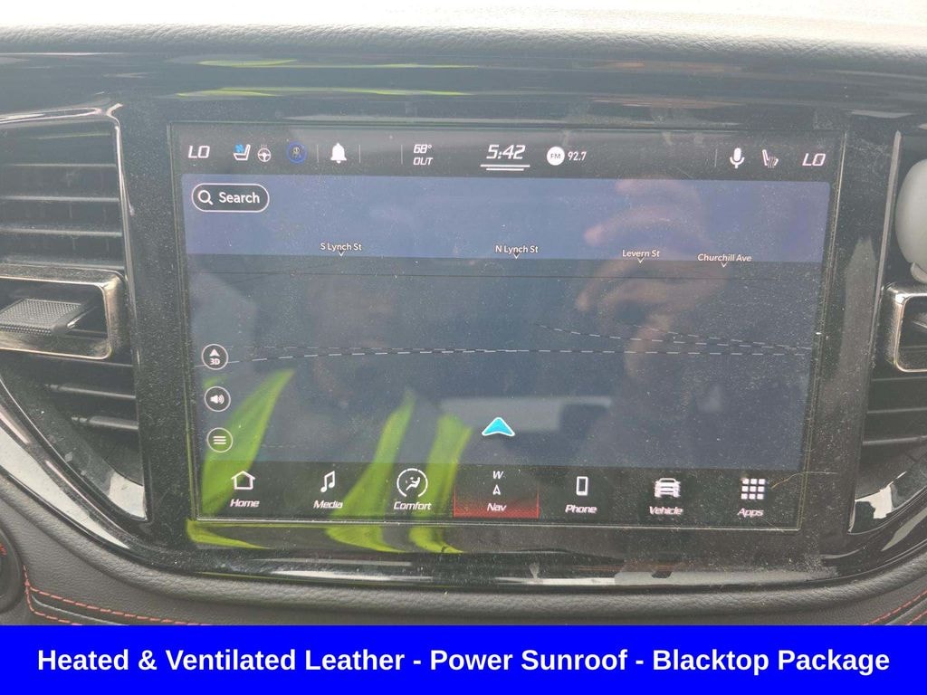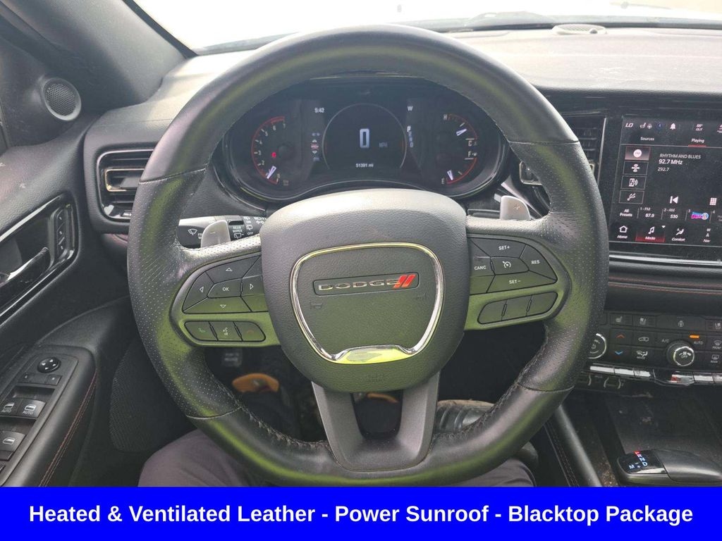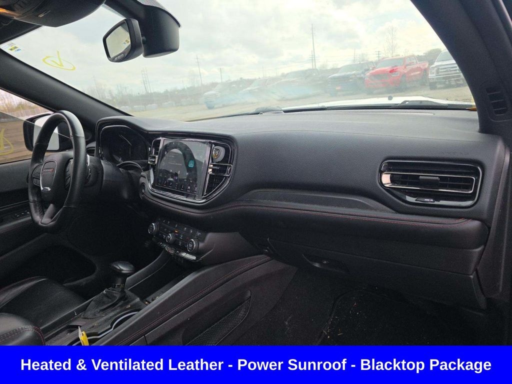 Apple CarPlay / Android Auto ð' Important: Ventilated seats + full leather usually come from packages like: Premium Interior Group Technology Group ð" Size & Practicality Seating: up to 7 passengers Cargo: ~17.2 cu ft behind 3rd row Still one of the roomier midsize SUVs ð'° Pricing (real-world) Original MSRP: ~$49K base (R/T AWD) Loaded builds: $55Kâ"$63K+ (with packages) ð' Used market (2026): Typically $28Kâ"$38K depending on mileage & condition ð§ Quick Take Pros: Strong V8 power (rare now) Good towing capability Comfortable + loaded features Aggressive styling Cons: Gas mileage isnât great Interior design is a bit dated vs newer SUVs 3rd row is usable but not huge âï¸ Compared to what you sent before Grand Wagoneer (2024): Ultra luxury, way bigger, twin-turbo 6 Durango R/T (2021): Sporty, cheaper, V8 muscle feel ð' Totally different vibe: Durango = âmuscle SUVâ Grand Wagoneer = âluxury tankâ If you want, I can: Compare this to a Durango SRT / Hellcat Tell you what to watch out for (common issues) Or check actual listings near you and whatâs a good deal right now, Durango R/T Power Sunroof, 4D Sport Utility, HEMI 5.7L V8 Multi Displacement VVT, 8-Speed Automatic, AWD, DB Black Clearcoat, Black w/Leather Trimmed Bucket Seats, Blacktop Package, Gloss Black Badges, Gloss Black Exterior Mirrors, GPS Navigation, Navigation System, Navigation system: TomTom, Quick Order Package 22S, Satin Black Dodge Tail Lamp Badge, Wheels: 20" x 8.0" Black Noise Aluminum.