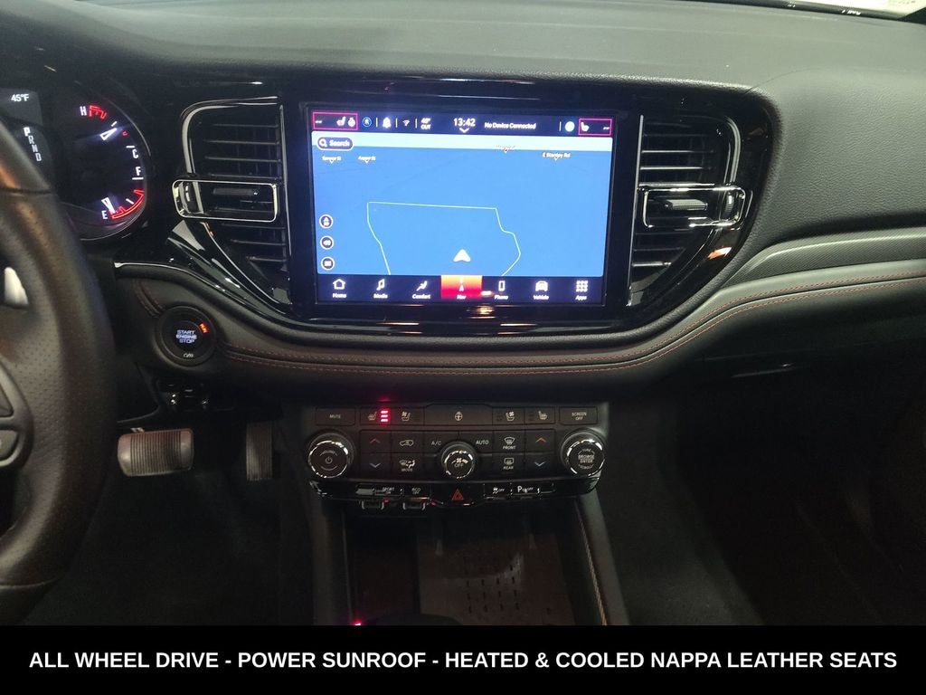 Clean CARFAX. ** Apple CarPlay/Android Auto, ** Adaptive Cruise Control, ** Blind Spot Monitor, ** Cross Traffic Alert, ** Alloy Wheels / Premium Wheels, ** Heated Seats, ** Cooled Seats, ** Bluetooth, Hands Free, ** Brake Assist, ** Camera Backup, ** Chrome Wheels / Premium Wheels / Custome Whwels, ** Cruise Control, ** Heated Steering Wheel, ** Keyless Entry, ** Lane Departure Warning, ** Leather Seats, ** LED Headlights, ** WiFi Hotspot, ** Memory Seat, ** Navigation System, ** Premium Sound System / Premium Audio, ** Stability Control, ** Steering Wheel Controls, ** Sunroof/Moonroof, ** Third Row Seating / 3rd Row Seating, ** Tow Hitch / Trailer Hitch, ** Clean Carfax Accident Free History, ** Power Drivers Seat, ** Power Passenger Seat, HEMI 5.7L V8 Multi Displacement VVT, ALL WHEEL DRIVE, AWD, Key Specs & Performance (2025 Durango R/T Plus AWD) Engine & Power 5.7 L HEMI V8. Bill Luke Chrysler Jeep Dodge Ram +2 Anderson Chrysler +2 Produces about 360 hp at 5,150 rpm and 390 lb-ft of torque at 4,250 rpm. J.D. Power Uses an 8-speed automatic transmission (8HP70). J.D. Power Drivetrain All-Wheel Drive (AWD) is standard on the R/T models. Hendrick Dodge +1 Fuel Economy J.D. Power lists the combined mpg as 18 mpg. J.D. Power According to Dodgeâs performance specs, the 5.7L V8âs estimated fuel economy (with AWD) is 14 city / 22 highway. dodge Fuel tank capacity: ~24.6 gallons, Towing Capacity Very capable: up to 7,200 lbs when properly equipped (per J.D. Power). J.D. Power Note: some sources list âTrailer Tow Groupâ as a feature for R/T Plus. Elk Grove CDJR Performance Features Drive-mode selector: different drive modes like Sport, Track, Tow, Snow (at least on some R/T versions) â" this gives flexibility for performance vs utility. youtube.com +1 Paddle shifters available (per Dodge performance page) for a more engaging shifting experience. dodge Adaptive damping / performance suspension (in R/T models) for better handling. youtube.com +1 Capacity / Size Seats up to 7 (third row included). J.D. Power Curb weight: for R/T Plus AWD, one dealer spec sheet lists ~5,313 lbs. Allen Mello Chrysler Jeep Dodge Ram Dimensions (per that spec sheet): Length ~200.8 in, Height ~72.1 in. Allen Mello Chrysler Jeep Dodge Ram Interior / Comfort Nappa leather-trimmed seats (with perforated inserts) in the Plus trim. Elk Grove CDJR Heated flat-bottom steering wheel. Elk Grove CDJR 8-way power front seats + memory settings. Elk Grove CDJR Power sunroof available. Elk Grove CDJR, Durango R/T Plus Power Sunroof, 4D Sport Utility, HEMI 5.7L V8 Multi Displacement VVT, 8-Speed Automatic, AWD, Vapor Gray, Black w/Leather Trimmed Bucket Seats, 115V Auxiliary Power Outlet, 7 & 4 Pin Wiring Harness, Adaptive Cruise Control w/Stop, Auto High Beam Headlamp Control, Auto-Dimming Exterior Driver Mirror, Black Roof Rails, Blind Spot w/Trailer Detection, Class IV Receiver Hitch, Dual Remote USB Port - Charge Only, Exterior Mirrors w/Heating Element, Exterior Mirrors w/Memory, Exterior Mirrors w/Supplemental Signals, Floor Console w/Leather Armrest, Full Speed Forward Collision Warning Plus, Gloss Black Exterior Mirrors, Heated Second Row Seats, Integrated Roof Rail Crossbars, Leather Trimmed Bucket Seats, Leather Wrapped Door Panels, LED Auxiliary Low Beam & Turn Signal, Navigation System, Power 6x9 Multi-Function Foldaway Mirrors, Power 8-Way Driver Memory 8-Way Passenger Seats, Power Driver/Passenger 4-Way Lumbar Adjust, Power Sunroof, Power Tilt & Telescopic Steering Column, Quick Order Package 22T R/T Plus, Radio/Driver Seat/Mirrors Memory, Rear Load Leveling Suspension, Red Accent Stitching, Trailer Brake Control, Trailer Tow Group IV, Ventilated Front Seats.