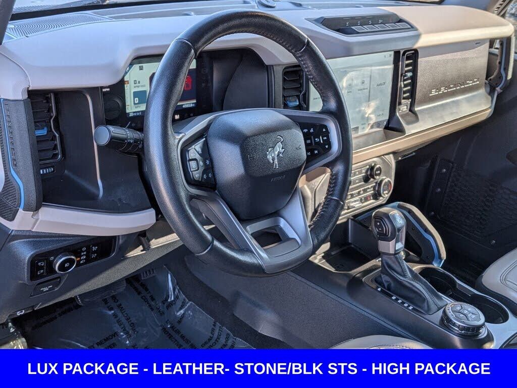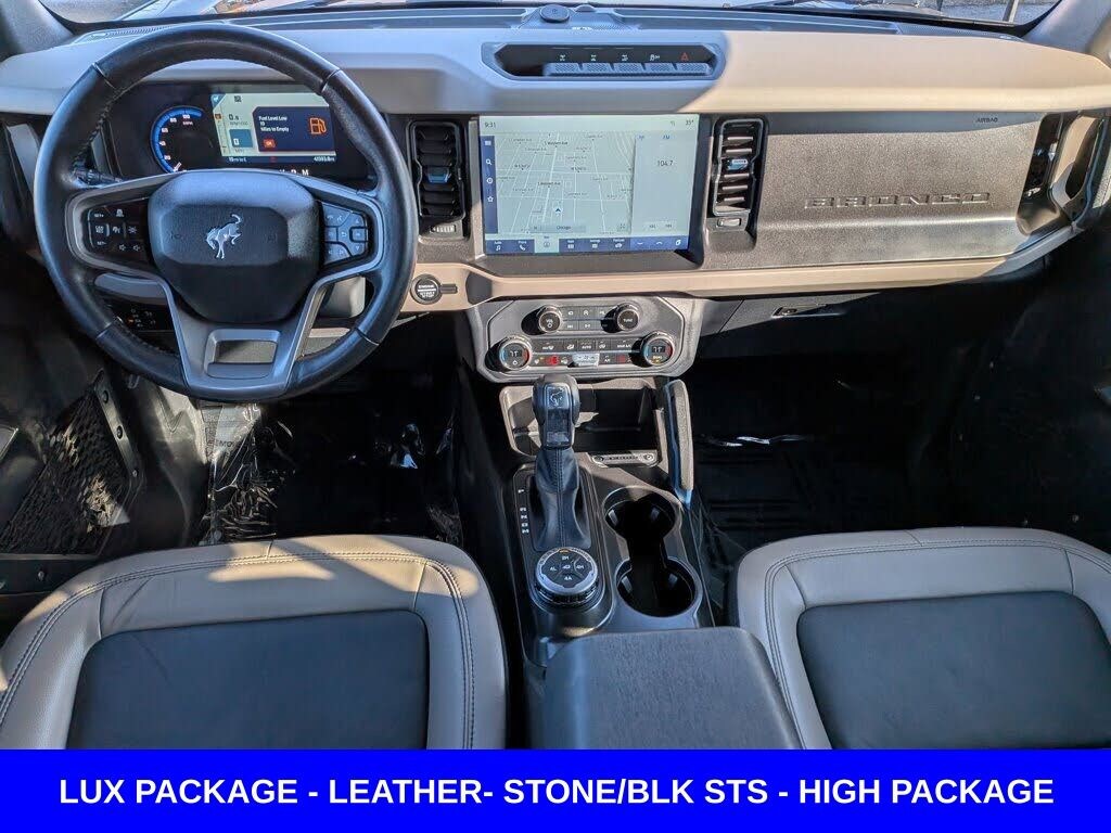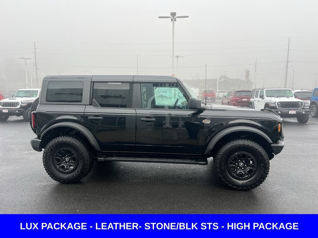 ** Apple CarPlay/Android Auto, ** Adaptive Cruise Control, ** Blind Spot Monitor, ** Cross Traffic Alert, ** Alloy Wheels / Premium Wheels, ** Heated Seats, ** Bluetooth, Hands Free, ** Brake Assist, ** Camera Backup, ** Chrome Wheels / Premium Wheels / Custome Whwels, ** Cruise Control, ** Heated Steering Wheel, ** Keyless Entry, ** Leather Seats, ** LED Headlights, ** Navigation System, ** Premium Sound System / Premium Audio, ** Stability Control, ** Steering Wheel Controls, ** Tow Hitch / Trailer Hitch, ** USB Port, ** Clean Carfax Accident Free History, ** Power Drivers Seat, HIGH PACKAGE, 12" LCD CTR STACK TOUCHSCREEN, LUX PACKAGE, 17"BLK ALM BEADLOCK BLK RING, CNCTD BLT-IN NAV(3-YR INC), HARD TOP, MOULDED-IN-COLOR, LTHR-TRM/VINYL SSTONE/BLK STS, What âWildtrakâ includes (base trim highlights) Standard 4x4 (Advanced 4WD system) 2.7L EcoBoost V6 (~330 hp, 415 lb-ft torque) Sasquatch Package (standard on Wildtrak): 35-inch tires Bilstein position-sensitive shocks Front & rear locking differentials High-clearance fender flares Trail-focused GOAT drive modes (Goes Over Any Terrain) ð' This is one of the most off-road-ready trims you can get from the factory. ð' What the Lux Package adds This is the top-tier tech package (above Mid & High): 12-inch touchscreen w/ SYNC 4 Adaptive cruise control 360-degree camera B&O premium sound system (10 speakers) Heated steering wheel Wireless charging pad Connected navigation Advanced safety features (lane centering, evasive steering assist) ðï¸ Leather Seats (what you get) Leather-trimmed seating (not standard on all Broncos), Bronco Wildtrak LUX PACKAGE, 4D Sport Utility, 2.7L EcoBoost V6, 10-Speed Automatic, 4WD, Shadow Black, Medium Sandstone w/Black Onyx, 12" LCD Capacitive Touchscreen w/Swipe Capability, 2 Smart Charging USB Ports In Dashboard, 360-Degree Camera, 7 Speakers, Adaptive Cruise Control, Additional Sound Deadening, Air Conditioning, AM/FM radio: SiriusXM with 360L, AM/FM Stereo, Automatic temperature control, Connected Built-In Navigation, Connected Navigation, Equipment Group 354A Lux Package, Evasive Steering Assist, Front dual zone A/C, Front Parking Sensors, Heated Steering Wheel, Information on Demand Panel, Navigation System, Navigation system: Connected Navigation, Radio data system, Radio: B&O Sound System by Bang & Olufsen, Sideview Mirrors, SiriusXM Radio w/360L, SYNC 4, Universal Garage Door Opener, Wireless Charging Pad.