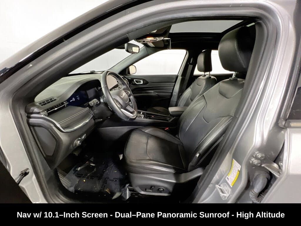 CARFAX One-Owner. Clean CARFAX. Odometer is 2196 miles below market average! ** Clean Carfax 1-Owner Accident Free History, ** Apple CarPlay/Android Auto, ** Adaptive Cruise Control, ** Blind Spot Monitor, ** Cross Traffic Alert, ** Alloy Wheels / Premium Wheels, ** Heated Seats, ** Bluetooth, Hands Free, ** Brake Assist, ** Camera Backup, ** Chrome Wheels / Premium Wheels / Custome Whwels, ** Cruise Control, ** Heated Steering Wheel, ** Keyless Entry, ** Lane Departure Warning, ** Leather Seats, ** LED Headlights, ** Navigation System, ** Power Panoramic (Pano) Sunroof / Moonroof, ** Premium Sound System / Premium Audio, ** Roof Rack, ** Stability Control, ** Steering Wheel Controls, ** Sunroof/Moonroof, ** USB Port, 4wd, 4x4, Dualâ"Pane Panoramic Sunroof, Uconnect® 5 Nav with 10.1â"Inch Touch Screen Display, HIGH ALTITUDE, Panoramic Roof / Sunroof Dual-pane panoramic sunroof is standard on the High Altitude trim â" this large glass roof spans much of the cabin, letting in extra light and providing an âopen-airâ feel. The front section typically tilts/opens, while the rear section is fixed glass. Drivetrain and Capability 4WD (Jeep Active Drive 4WD) paired with a 2.4 L Tigershark 4-cylinder engine and a 9-speed automatic transmission. Includes Selec-Terrain traction management for different road/weather conditions., Exterior Highlights 19-inch painted wheels with Satin Granite Crystal finish. Gloss Black roof and neutral gray accents for a premium two-tone appearance. Premium full LED lighting (projector headlamps, taillamps, fog lamps). Interior & Tech Leather upholstery with Tungsten accent stitching. 10.1-inch Uconnect 5 touchscreen with navigation, Apple CarPlay & Android Auto. 10.25-inch digital driver information cluster. Premium Alpine audio system in many configurations. Comfort & Convenience Options Heated seats, heated steering wheel (varies by package/market). Available features in used listings include wireless charging, Wi-Fi hotspot, blind-spot monitoring, park assist, and more â" depending on optional packages equipped, Compass High Altitude Panoramic Roof, 4D Sport Utility, 2.4L I4, 9-Speed 948TE Automatic, 4WD, Billet Silver Metallic Clearcoat, Black Leather, GPS Navigation, Navigation System.