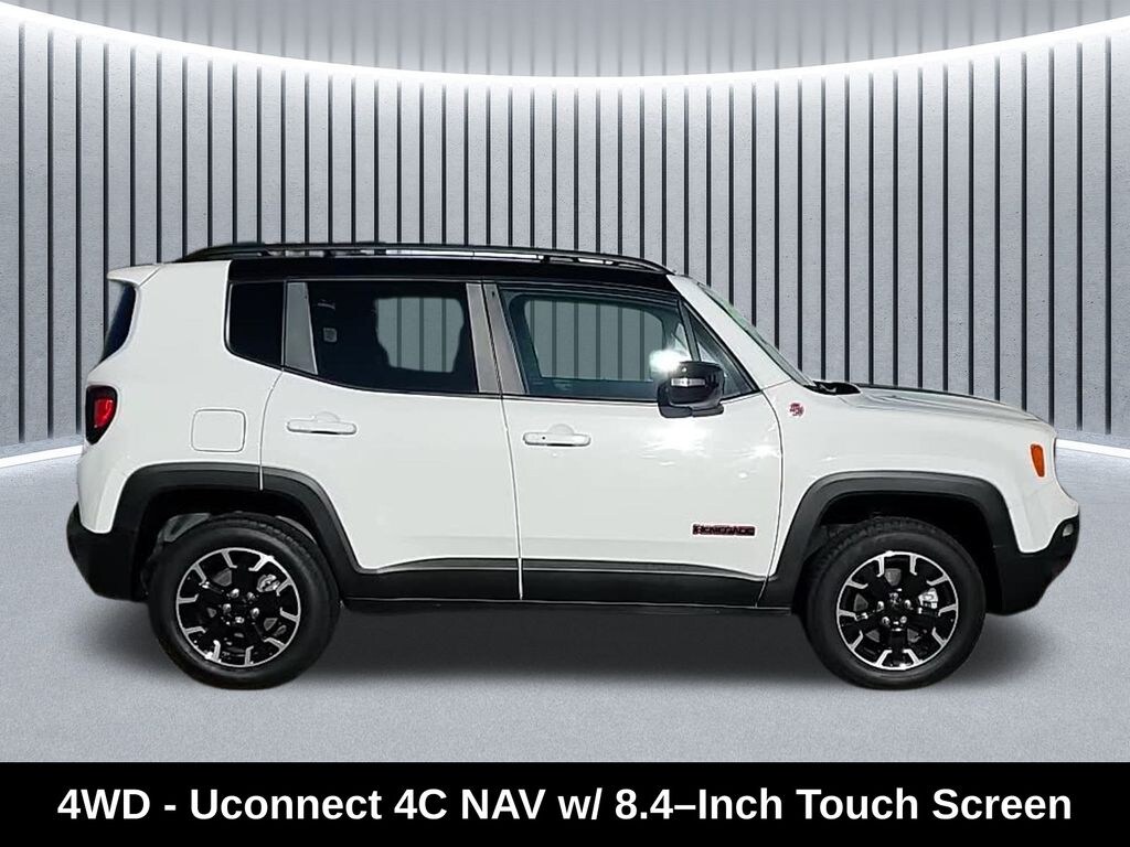 ** Apple CarPlay/Android Auto, ** Blind Spot Monitor, ** Cross Traffic Alert, ** Alloy Wheels / Premium Wheels, ** Bluetooth, Hands Free, ** Camera Backup, ** Chrome Wheels / Premium Wheels / Custome Whwels, ** Cruise Control, ** Keyless Entry, ** LED Headlights, ** Premium Sound System / Premium Audio, ** Roof Rack, ** Stability Control, ** Steering Wheel Controls, ** USB Port, 4WD, 4X4, 17â"Inch x 7.0â"Inch Glossy Black Diamond Cut Wheels, Key Specs & Features Engine & Performance Powered by a 1.3 L turbocharged MultiAir inlineâ4 producing 177 hp and 210 lbâft torque, paired with a 9âspeed automatic transmission www.marinadodgeny.com +14 U.S. News Cars +14 MoparInsiders +14 . Drivetrain & OffâRoad Setup Standard Jeep Active Drive Low full-time 4Ã4 system with a 21:1 crawl ratio, SelecâTerrain® with Rock mode, hillâdescent control, skid plates, and front/rear tow hooks. It rides about 0.8" higher than standard models for improved approach/departure angles Bell Mitsubishi +2 cdjrdrivesohio.com +2 Bell Mitsubishi +4 Group 1 Automotive +4 Reddit +4 . Fuel Economy EPA estimated at 22 mpg city, 27 mpg highway, with overall 24 mpg combined; uses premium unleaded fuel Edmunds . Capacity & Dimensions Seating for 5, cargo volume up to 50.8 cu ft (rear seats folded), ground clearance of around 8.7 in, curb weight ~3,527 lbs, and towing capacity 2,000 lbs . Standard & Optional Comfort Heated front seats & steering wheel, leather-trim options, Uconnect infotainment (7" or 8.4" touchscreen with Apple CarPlay/Android Auto), available panoramic sunroof, navigation, and more, Renegade Trailhawk 4WD, 4D Sport Utility, 1.3L I4, 9-Speed 948TE Automatic, 4WD, Alpine White Clearcoat, Black Cloth, Navigation System, Quick Order Package 22C.