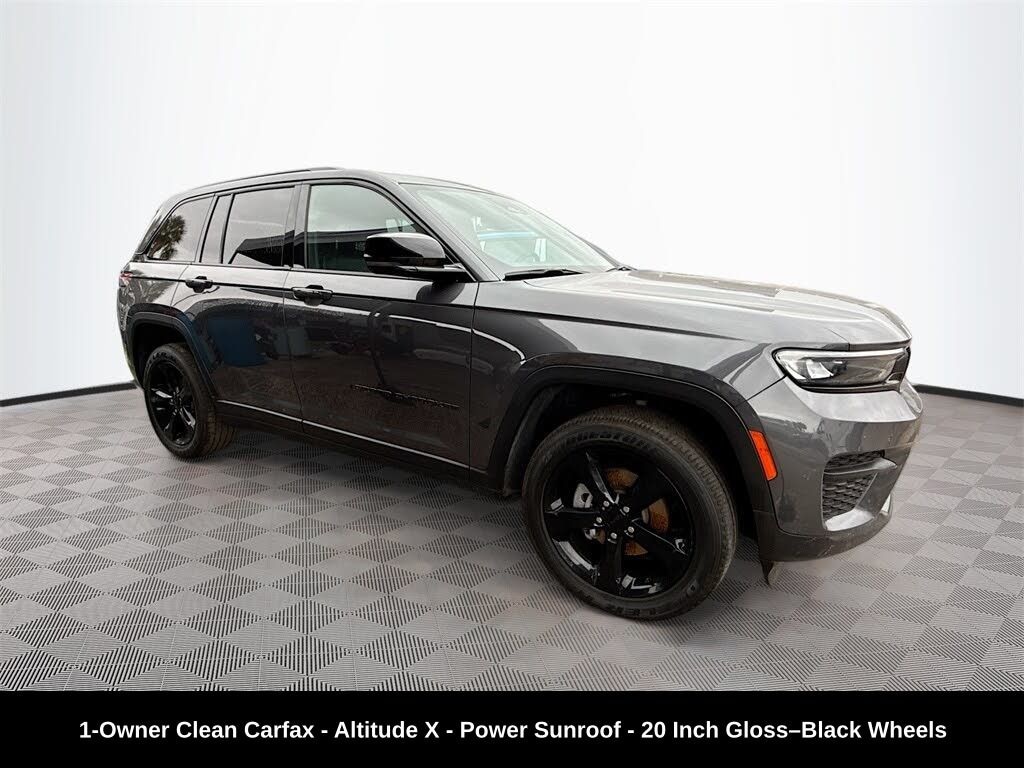 CARFAX One-Owner. Clean CARFAX. ** Clean Carfax 1-Owner Accident Free History, ** Apple CarPlay/Android Auto, ** Adaptive Cruise Control, ** Blind Spot Monitor, ** Cross Traffic Alert, ** Alloy Wheels / Premium Wheels, ** Heated Seats, ** Bluetooth, Hands Free, ** Brake Assist, ** Camera Backup, ** Chrome Wheels / Premium Wheels / Custome Whwels, ** Cruise Control, ** Heated Steering Wheel, ** Keyless Entry, ** Lane Departure Warning, ** Leather Seats, ** LED Headlights, ** Premium Sound System / Premium Audio, ** Roof Rack, ** Stability Control, ** Steering Wheel Controls, ** Sunroof/Moonroof, ** USB Port, ** Clean Carfax Accident Free History, ** One Owner, ** Power Drivers Seat, Uconnect® 5 with 8.4â"Inch Touch Screen Display, Altitude X, Capri Leatherette / Suede Seats, 20â"inch x 8.5â"Inch Glossâ"Black Painted Alum Wheels, Power Sunroof, Glossâ"Black Exterior Accents, Engine & Performance 3.6 L V-6 Pentastar engine (naturally aspirated) â" ~293 hp and 260 lb-ft torque paired with an 8-speed automatic transmission. Four-wheel drive (Quadra-Trac I system on 4WD models). Exterior Features Power sunroof (standard on Altitude X). Gloss black exterior accents (black-out styling cues). 18â²â² fully painted aluminum wheels (some inventory options may have 20â²â²). Heated mirrors, rain-sensitive windshield wipers. Interior & Comfort Black headliner and premium upholstery (Capri leatherette/suede). Heated front seats & heated steering wheel. Power liftgate and wireless phone charging pad. Keyless entry and remote start system. Technology & Safety Uconnect infotainment (typically with a large touchscreen). Adaptive Cruise Control with Stop & Go (available on some builds). Blind Spot Monitoring and Forward Collision Warning systems. Rear back-up camera and parking sensors. Wi-Fi hotspot capability., Grand Cherokee Altitude X Power Sunroof, 4D Sport Utility, 3.6L V6 24V VVT, 8-Speed Automatic, 4WD, Baltic Gray Metallic Clearcoat, Global Black Artificial Leather, 115V Auxiliary Power Outlet, Altitude Appearance Package, Altitude Package, Altitude X, Black Headliner, Capri Leatherette/Suede Seats, Delete Laredo Badge, Gloss Black Exterior Accents, Heated Front Seats, Heated Steering Wheel, Power Liftgate, Power Sunroof, Quick Order Package 23M Altitude X, Rain Sensitive Windshield Wipers, Remote Start System, Selectable Tire Fill Alert, Wheels: 18" x 8" Fully Painted Aluminum 1, Wireless Charging Pad.
