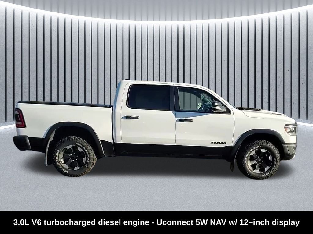 Clean CARFAX. ** Apple CarPlay/Android Auto, ** Adaptive Cruise Control, ** Alloy Wheels / Premium Wheels, ** Heated Seats, ** Bluetooth, Hands Free, ** Brake Assist, ** Camera Backup, ** Chrome Wheels / Premium Wheels / Custome Whwels, ** Cruise Control, ** Heated Steering Wheel, ** Keyless Entry, ** Lane Departure Warning, ** Leather Seats, ** Navigation System, ** Premium Sound System / Premium Audio, ** Stability Control, ** Steering Wheel Controls, ** Tow Hitch / Trailer Hitch, ** USB Port, ** Clean Carfax Accident Free History, ** Power Drivers Seat, 3.0L V6 turbocharged diesel engine, Front heated seats, Uconnect 5W NAV with 12â"inch display, 9 Alpine speakers with subwoofer, Key Specifications & Equipment Engine: 3.0 L EcoDiesel V6, paired with an 8-speed automatic transmission. digimag.rrd.com +2 digimag.rrd.com +2 Output: ~260 hp and ~480 lb-ft of torque. hooverjeepchrysler.net +2 laportechrysler.net +2 Towing capacity: Up to ~12,560 lb when properly equipped (diesel version) for the 1500 series. mcfaddenfriendly.com +2 Kendall Dodge Chrysler Jeep Ram +2 Drivetrain: 4Ã4 (four-wheel drive) on the Crew Cab format. The âRebelâ trim is offâroad oriented. Automobile Catalog +1 Rear axle ratio options: The spec sheet shows for the 3.0 EcoDiesel version you can get axle ratios like 3.92. Amazon Web Services, Inc. +1, Off-road / Rebelâspecific gear: The Rebel trim includes features like unique styling (hood, fender flares), raised ride height, eLocker (electronic locking rear differential) depending on Off-Road / 4Ã4 package. digimag.rrd.com +1 Realâworld fuel economy: Owners report highway MPG in the mid-20s MPG for the EcoDiesel version. Fuelly +1 Interior & tech: Being the Rebel trim, expect more rugged/offâroad styling and comforts such as heated seats/steering wheel (depending on equipment), and good connectivity, 1500 Rebel 4WD CREW CAB, 4D Crew Cab, EcoDiesel 3.0L V6, 8-Speed Automatic, 4WD, Bright White Clearcoat, Red/Black w/Cloth/Vinyl Low Back Bucket Seats or Lux Leather Trimmed Bucket Seats, Cold Weather Group (DISC), Engine Block Heater, GPS Navigation, MOPAR Winter Front Grille Cover, Navigation System, Quick Order Package 28W Rebel.