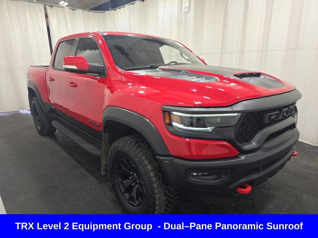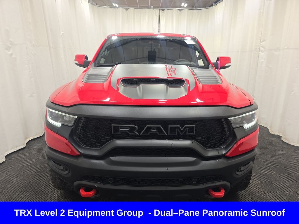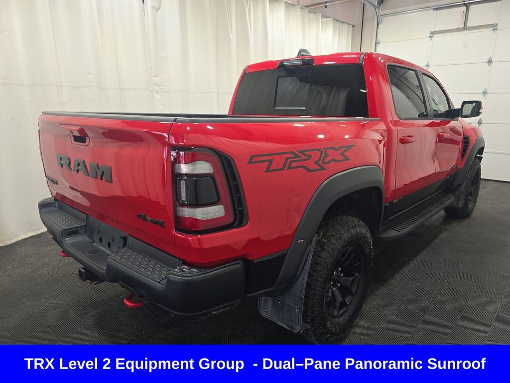 ** Apple CarPlay/Android Auto, ** Adaptive Cruise Control, ** Blind Spot Monitor, ** Cross Traffic Alert, ** Alloy Wheels / Premium Wheels, ** Heated Seats, ** Cooled Seats, ** Bluetooth, Hands Free, ** Brake Assist, ** Camera Backup, ** Chrome Wheels / Premium Wheels / Custome Whwels, ** Cruise Control, ** Head-Up Display, ** Heated Steering Wheel, ** Keyless Entry, ** Lane Departure Warning, ** Leather Seats, ** LED Headlights, ** Navigation System, ** Power Panoramic (Pano) Sunroof / Moonroof, ** Premium Sound System / Premium Audio, ** Stability Control, ** Steering Wheel Controls, ** Sunroof/Moonroof, ** Tow Hitch / Trailer Hitch, ** USB Port, ** Power Drivers Seat, ** Power Passenger Seat, ** Heated Rear Seats, Rear ventilated seats, Triâ"Fold Tonneau Cover, TRX Red interior accents, Dualâ"Pane Panoramic Sunroof, Mopar TRX exterior graphics, Mopar TRX hood graphics, Mopar offâ"road style running boards, Model: 2022 Ram 1500 TRX (top performance trim) Engine: 6.2L supercharged HEMI V8 â' ~702 horsepower Drivetrain: 4WD (off-road beast) Transmission: 8-speed automatic Body: Crew cab pickup This is Ramâs answer to the Ford Raptorâ"but more aggressive and powerful. â TRX Level 2 Equipment Package (BIG deal) The Level 2 package (~$10k option new) adds a ton of premium features : Heated & ventilated leather seats (front + rear) Heads-up display Adaptive cruise control Lane keep assist & advanced safety tech Premium audio (Harman Kardon) Digital rearview mirror Wireless charging + upgraded interior materials ð' Translation: this turns the TRX from âraw off-road truckâ into a luxury performance truck. ð Panoramic Roof Dual-pane panoramic sunroof Opens up most of the cabin Included with higher trims/packages, 1500 TRX Panoramic Roof, 4D Crew Cab, 6.2L Supercharged HEMI V8 SRT, 8-Speed Automatic, 4WD, Flame Red Clearcoat, Black w/Premium Leather Trimmed Bucket Seats, 2-Door Passive Entry, Front Door Locks, Adaptive Cruise Control w/Stop & Go, Advanced Safety Group, Blind Spot & Cross Path Detection, Body Color Door Handles, Digital Rearview Mirror, Driver Seat Memory, Driver/Passenger Wrapped Assist Handles, Exterior Mirrors w/Memory, Front Door Accent Lighting, Full Length Premium Upgraded Floor Console, harman/kardon 19 Speaker Premium Sound, Heads-Up Display, Heated Second Row Seats, Heated Steering Wheel, IP LED Ambient Light Pipe, Lane Keep Assist, Leather Trimmed Bucket Seats, Leather/Suede Flat-Bottom Steering Wheel, LED CHMSL Lamp, Luxury Front Door Trim Panel, MOPAR Bright Pedal Kit, Navigation System, ParkSense Front/Rear Park Assist w/Stop, Pedestrian Emergency Braking, Pick-Up Box Lighting, Power 8-Way Driver & Passenger Seats, Power Adjustable Pedals w/Memory, Premium Wrapped IP Bezel, Quick Order Package 29Y, Radio/Driver Seat/Mirrors/Pedals Memory, Rain Sensitive Windshield Wipers, Rear 60/40 Folding Split Recline Seat, Rear Door Accent Lighting, Rear Underseat Compartment Storage, Rear Window Defroster, Remote Tailgate Release, Sun Visors w/Illuminated Vanity Mirrors, Surround View Camera System, Tailgate Ajar Warning Lamp, Trailer Brake Control, Trailer Light Check, Trailer Tire Pressure Monitoring System, Trailer Tow Group, TRX Level 2 Equipment Group, Universal Garage Door Opener, Ventilated Front Seats, Ventilated Rear Seats, Wireless Charging Pad.