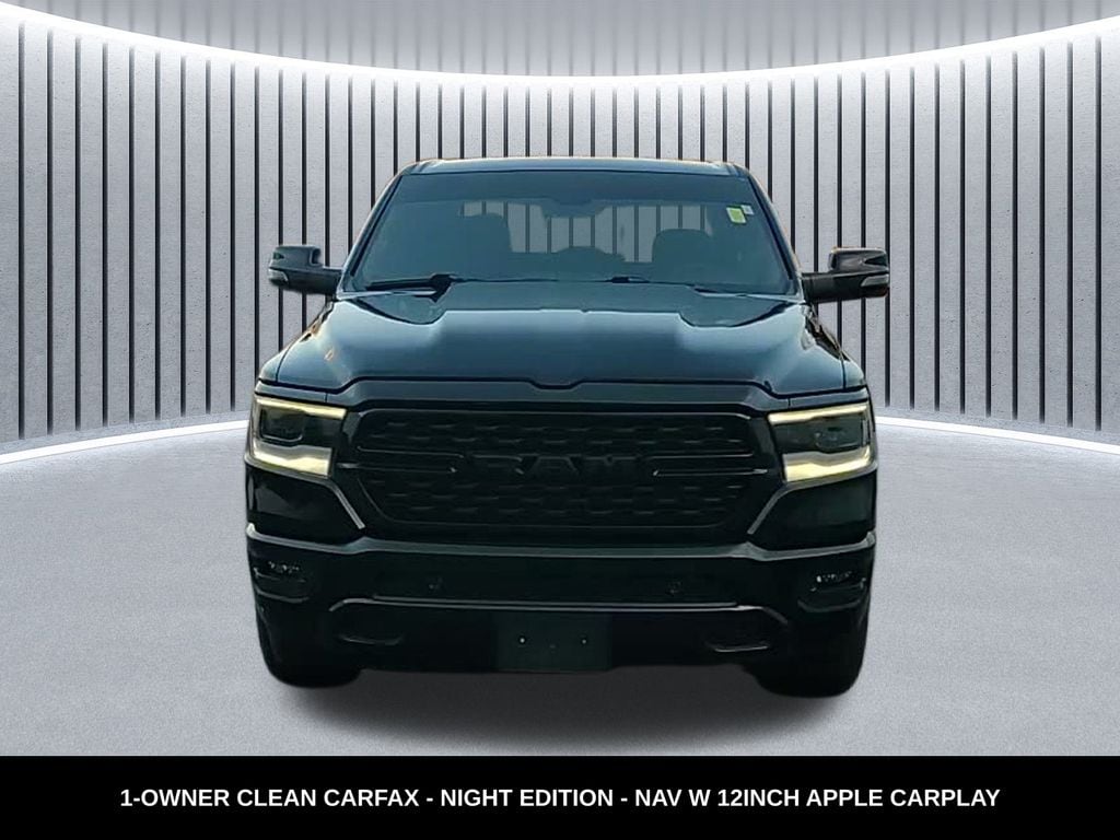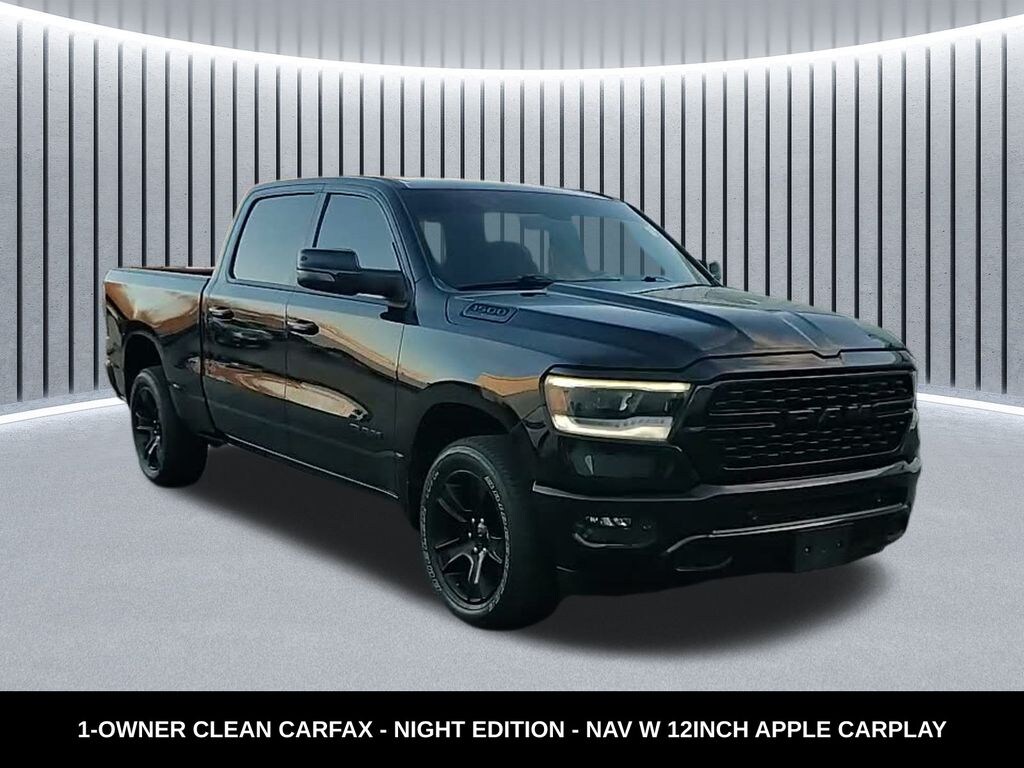 CARFAX One-Owner. Clean CARFAX. Odometer is 11529 miles below market average! ** Apple CarPlay/Android Auto, ** Alloy Wheels / Premium Wheels, ** Heated Seats, ** Bluetooth, Hands Free, ** Brake Assist, ** Camera Backup, ** Chrome Wheels / Premium Wheels / Custome Whwels, ** Cruise Control, ** Heated Steering Wheel, ** Keyless Entry, ** LED Headlights, ** Navigation System, ** Premium Sound System / Premium Audio, ** Stability Control, ** Steering Wheel Controls, ** USB Port, ** Clean Carfax Accident Free History, ** One Owner, ** Power Drivers Seat, Uconnect® 5 Nav with 12.0â"Inch Touch Screen Display, Night Edition, Uconnect® 5 Nav with 12.0â"Inch Touch Screen Display, Trailer Brakeâ"Controller, 2023 Ram 1500 Big Horn / Lone Star Night Edition: Overview The Night Edition isnât a separate trim level by itself but an optional package that can be added to the Ram 1500 lineup, including the Big Horn or Lone Star trims. It focuses mostly on styling and appearance enhancements while keeping the reliable performance and capability of the standard 5.7 L V8 1500., The Night Edition package gives the truck a more aggressive and monochromatic look compared to the standard chrome-accented Big Horn/Lone Star, typically including: ramtrucks +1 Exterior âNightâ Styling Blacked-out accents (grille surround, badges, and trim) Black-painted aluminum wheels (often 20â²â² or Gloss Black finishes) Black dual exhaust tips (with V8 engines) Sport performance hood or dark grille aesthetic Black bezel headlights and other dark exterior elements Interior & Tech Highlights The Night Edition package may include upgraded interior accents and possibly the 12â²â² digital gauge cluster depending on options selected (availability can vary by region and dealer build) â" more modern displays and styling. ramtrucks, 1500 Big Horn/Lone Star Night Edition, 4D Crew Cab, HEMI 5.7L V8 Multi Displacement VVT eTorque, 8-Speed Automatic, 4WD, Diamond Black Crystal Pearlcoat, Black Cloth, 115V Auxiliary Power Outlet, 2nd Row In Floor Storage Bins, 400W Inverter, 4G LTE Wi-Fi Hot Spot, 8.4" Touchscreen Display, 9 Amplified Speakers w/Subwoofer, Accent Color Door Handles, Accent Color Premium Power Mirrors, Air Conditioning ATC w/Dual Zone Control, Anti-Spin Differential Rear Axle, Apple CarPlay, Auto-Dimming Exterior Driver Mirror, Auto-Dimming Rear-View Mirror, Big Horn Badge, Big Horn Level 2 Equipment Group (DISC), Black Exterior Mirrors, Black Exterior Truck Badging, Black Headlamp Bezels, Black Interior Accents, Black Painted Exterior Mirrors Caps, Black Premium Power Mirrors, Bluetooth Handsfree Phone & Audio, Body Color Front Bumper, Body Color Rear Bumper w/Step Pads, Class IV Receiver Hitch, Cluster 7.0" TFT Color Display, Connectivity - US/Canada, Convex Wide-Angle Exterior Mirror Insert, Deluxe Cloth Bucket Seats, Dual Exhaust w/Black Tips, Electric Shift-On-Demand Transfer Case, Exterior Mirrors Courtesy Lamps, Exterior Mirrors w/Heating Element, Exterior Mirrors w/Supplemental Signals, For Details, Visit DriveUconnect.com, For More Info, Call 800-643-2112, Front Fog Lamps, Front LED Fog Lamps, Glove Box Lamp, Google Android Auto, GPS Antenna Input, GPS Navigation, Grille Surround 1 Black Texture 2 Black, Heated Front Seats, Heated Steering Wheel, Integrated Center Stack Radio, LED Footwell Lighting, LED Reflector Headlamps, LED Taillamps, Media Hub w/2 Charge Only USBs, Navigation System, Night Edition, ParkSense Front/Rear Park Assist w/Stop, Power 2-Way Driver Lumbar Adjust, Power 8-Way Driver Seat, Power Adjustable Pedals, Power-Folding Mirrors, Premium Lighting Group, Quick Order Package 27Z Big Horn, Radio: Uconnect 5 W w/8.4" Display, RAM Grille Badge - Black, Rear Dome w/On/Off Switch Lamp, Rear Power Sliding Window, Rear Window Defroster, Remote Start System, Security Alarm, SiriusXM Satellite Radio, Sun Visors w/Illuminated Vanity Mirrors, Universal Garage Door Opener, USB Host Flip, Wheels: 20" x 9.0" Premium Paint/Polished.