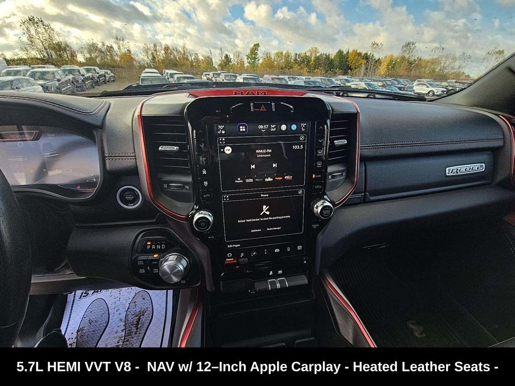 Clean CARFAX. Odometer is 5377 miles below market average! ** Apple CarPlay/Android Auto, ** Adaptive Cruise Control, ** Alloy Wheels / Premium Wheels, ** Heated Seats, ** Bluetooth, Hands Free, ** Brake Assist, ** Camera Backup, ** Chrome Wheels / Premium Wheels / Custome Whwels, ** Cruise Control, ** Heated Steering Wheel, ** Keyless Entry, ** Leather Seats, ** LED Headlights, ** Navigation System, ** Premium Sound System / Premium Audio, ** Stability Control, ** Steering Wheel Controls, ** USB Port, ** Clean Carfax Accident Free History, ** Power Drivers Seat, Rebel Level 1 Equipment Group, Uconnect 5W NAV with 12â"inch display, 5.7L HEMI VVT V8 engine with FuelSaver MDS, Black Mopar tubular side steps, Mopar sprayâ"in bedliner, Hereâs a clear overview of the 2023 Ram 1500 Rebel Crew Cab with the 5.7 L HEMI V8 engine and heated seats â" what you can expect in terms of features and how heated seating is equipped: ð"¥ Heated Seats (Front & Rear) â" Heated front seats â" standard on the Rebel with the Level 1 or Level 2 Equipment Group. â" Heated steering wheel included with the same packages. â" Heated rear seats â" depending on how the truck was built or what dealer-added packages it has (often part of higher equipment group or option packages). Some listings show rear heated seats available, but they arenât always standard on every 2023 Rebel. ð' In most 2023 Rebel configurations with the base Rebel Level 1 or Level 2 Equipment Group, the heated seats youâll get are heated front seats plus a heated steering wheel. Heated rear seats may be included or added in specific option packages or dealer configurations. ð Other Key Features on a 2023 Rebel Crew Cab Engine: 5.7 L HEMI V8 with eTorque (â395 hp / 410 lb-ft of torque). Transmission: 8-speed automatic. Drivetrain: 4Ã4 available (most Rebels are 4Ã4). Interior comfort items often included with equipment packages: Remote Start Dual-zone automatic climate control Power front seats Heated steering wheel Keyless entry/Go Large touchscreen infotainment/navigation, 1500 Rebel 4WD CREW CAB 5.7 V8 HEMI, 4D Crew Cab, HEMI 5.7L V8 Multi Displacement VVT eTorque, 8-Speed Automatic, 4WD, Bright White Clearcoat, Red/Black w/Cloth/Vinyl Low Back Bucket Seats or Lux Leather Trimmed Bucket Seats, Bed Utility Group, Black Exterior Mirrors, Cold Weather Group (DISC), Engine Block Heater, Exterior Mirrors Courtesy Lamps, Exterior Mirrors w/Heating Element, Exterior Mirrors w/Memory, Exterior Mirrors w/Supplemental Signals, GPS Navigation, Mirror Clearance/Running Lights, Mirror-Mounted Aux Reverse Lamps, MOPAR 4 Adjustable Cargo Tie-Down Hooks, MOPAR Winter Front Grille Cover, Navigation System, Pick-Up Box Lighting, Power-Folding Mirrors, Quick Order Package 27W Rebel, Trailer Brake Control, Trailer Light Check, Trailer Reverse Steering Control, Trailer Tire Pressure Monitoring System, Trailer Tow Group, Trailer Tow Mirrors.