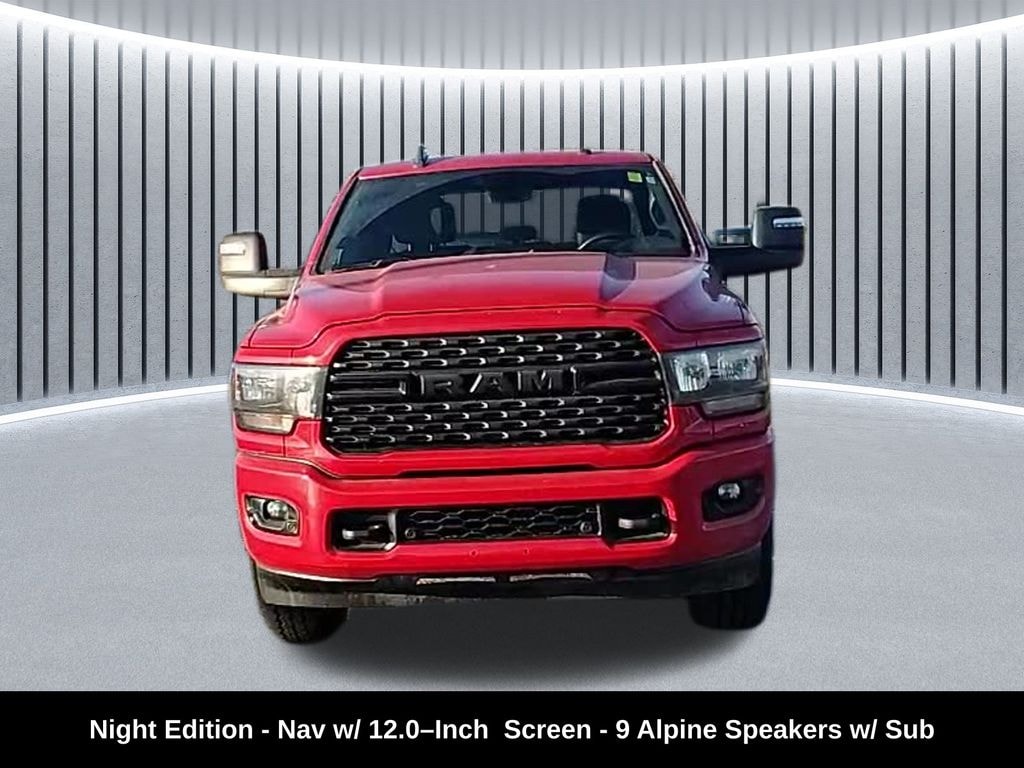 Clean CARFAX. Odometer is 1331 miles below market average! ** Clean Carfax 1-Owner Accident Free History, ** Apple CarPlay/Android Auto, ** Alloy Wheels / Premium Wheels, ** Bluetooth, Hands Free, ** Brake Assist, ** Camera Backup, ** Chrome Wheels / Premium Wheels / Custome Whwels, ** Cruise Control, ** Keyless Entry, ** LED Headlights, ** Navigation System, ** Premium Sound System / Premium Audio, ** Stability Control, ** Steering Wheel Controls, ** Tow Hitch / Trailer Hitch, ** USB Port, ** Clean Carfax Accident Free History, ** One Owner, ** Power Drivers Seat, 4WD, 4X4, The Night Edition package contributes the following aesthetic and equipment upgrades: Black painted aluminium 20â²â² x 8.0â²â² wheels (in many cases) with black center hub. progressivejeep.com +1 Black exterior badging (Ram head, tailgate badge) instead of chrome. Randall Dodge Chrysler Jeep Ram +1 Black headlamp bezels & black tail-lamp bezels. Earnhardt Auto Centers Body-colour front & rear bumpers (or painted bumpers) rather than chrome. Randall Dodge Chrysler Jeep Ram +1 Gloss black ânostrilsâ / MIC black grille, body-colour door handles. Earnhardt Auto Centers +1 Interior: Black accents, likely cloth seats (Big Horn) unless upgraded. Some listings show upgraded infotainment / display options (12.0â touchscreen in some Night Edition units) although this might depend on equipment group. Randall Dodge Chrysler Jeep Ram +1, Payload & Towing: The 6.4L gas V8 offers strong performance, but diesel versions (6.7L Cummins) may offer higher torque and towing capacity. If youâre towing heavy loads regularly, check exactly the tow and payload specs for that configuration., Engine: 6.4 L HEMI V8 (gas) with MDS (Multi-Displacement System) and VVT. Dealer eProcess +1 Transmission: 8-speed automatic. Elk Grove CDJR +1 4Ã4 (Four-Wheel Drive) capability: yes, part-time 4WD with âelectronic shift-on-the-flyâ transfer case for these heavy-duty trucks. Dealer eProcess GVWR (Gross Vehicle Weight Rating): example listing shows ~10,000 lbs. Redlands CDJR +1 Bed & Dimensions: example used listing for Big Horn Night Edition lists width ~83.5", length ~238.8", height ~80.2", bed length ~76.3". Redlands CDJR Axle ratio: Many examples show 3.73 axle ratio., Antiâ"Spin Differential Rear Axle, Flat Cabâ"Length Painted Sideâ"Steps, 9 Alpine® Speakers with Subwoofer, Uconnect® 5 Nav with 12.0â"Inch Touch Screen Display, 2500 Big Horn NIGHT EDITION, 4D Crew Cab, 6.4L V8, 8-Speed Automatic, 4WD, Flame Red Clearcoat, Black Cloth, 2nd Row In Floor Storage Bins, 4G LTE Wi-Fi Hot Spot, 8.4" Touchscreen Display, Apple CarPlay, Auto Power-Folding Mirrors, Bed Utility Group, Big Horn IP Badge, Black Exterior Mirrors, Black Exterior Truck Badging, Black Headlamp Bezels, Black Interior Accents, Black Ram Head Tailgate Badge, Black Tail Lamp Bezels, Bluetooth Handsfree Phone & Audio, Body Color Door Handles, Body Color Grille Surround, Center Hub, Connectivity - US/Canada, Dual Glove Boxes, Exterior Mirrors Courtesy Lamps, Exterior Mirrors w/Heating Element, Exterior Mirrors w/Supplemental Signals, Foam Bottle Insert (Door Trim Panel), Footwell Courtesy Lamp, For Details, Visit DriveUconnect.com, For More Info, Call 800-643-2112, Forward & Reverse Utility Lights, Front Fog Lamps, Global Telematics Box Module (TBM), Gloss Black Nostrils/MIC Black Grille, Glove Box Lamp, Google Android Auto, GPS Antenna Input, GPS Navigation, Integrated Center Stack Radio, Integrated Voice Command w/Bluetooth, Leather Wrapped Steering Wheel, LED Bed Lighting, Level 1 Equipment Group, Locking Lower Glove Box, Mirror Running Lights, MOPAR Deployable Bed Step, MOPAR Spray In Bedliner, Navigation System, Night Edition, Painted Front Bumper, Painted Rear Bumper, ParkSense Front/Rear Park Assist System, Power Adjust Mirrors, Power Adjustable Convex Aux Mirrors, Power Heated Fold Telescope Mirrors, Power Telescoping Mirrors, Premium Cloth 40/20/40 Bench Seat, Protection Group, Quick Order Package 2
