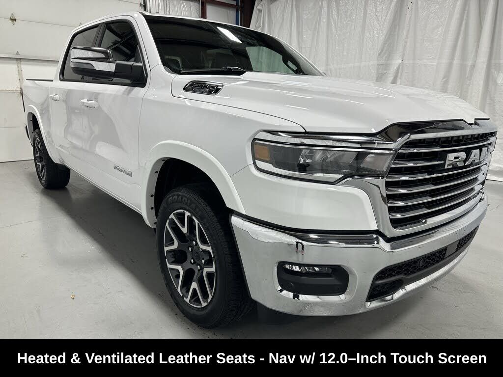 CARFAX One-Owner. Clean CARFAX. Odometer is 10212 miles below market average! ** Clean Carfax 1-Owner Accident Free History, ** Apple CarPlay/Android Auto, ** Adaptive Cruise Control, ** Blind Spot Monitor, ** Cross Traffic Alert, ** Alloy Wheels / Premium Wheels, ** Heated Seats, ** Cooled Seats, ** Bluetooth, Hands Free, ** Brake Assist, ** Camera Backup, ** Chrome Wheels / Premium Wheels / Custome Whwels, ** Cruise Control, ** Heated Steering Wheel, ** Keyless Entry, ** Lane Departure Warning, ** Leather Seats, ** LED Headlights, ** Navigation System, ** Premium Sound System / Premium Audio, ** Stability Control, ** Steering Wheel Controls, ** Tow Hitch / Trailer Hitch, ** USB Port, ** Clean Carfax Accident Free History, ** Power Drivers Seat, ** Power Passenger Seat, ** Heated Rear Seats, Crew Cab 4WD, 3.0L I6 Hurricane SO Twin Turbo, Features Common on Laramie (3.0L) Leather-trimmed or premium seats (bench or bucket style depending on package). Ken Garff Auto Group Adaptive Cruise Control, Blind-Spot Monitoring, and advanced safety tech available. Rairdon's Infotainment: Uconnect system with available navigation and large touchscreen. Ken Garff Auto Group Apple CarPlay / Android Auto, Backup Camera, ParkSense parking aids. Rairdon's Trim packages vary (Level 1, Level 2, Night Edition, etc.), and options like premium wheels, upgraded sound package, panoramic sunroof, and bed utility add to comfort and value., 2025 Ram 1500 Laramie 4WD Crew Cab â" Key Specs Engine & Performance Engine: 3.0L Inline-6 Hurricane Twin-Turbo (SO) â" standard on this configuration. Ken Garff Auto Group +1 Horsepower: ~420 hp. J.D. Power Torque: ~469 lb-ft. J.D. Power Transmission: 8-speed automatic (8HP75). Ken Garff Auto Group Drivetrain: Four-Wheel Drive (4WD). J.D. Power Fuel Economy EPA Estimates: approx 17 mpg city / 24 mpg highway for the 4WD Crew Cab with this engine. J.D. Power Towing & Capability Max Towing: up to about 8,110 lbs on typical 3.0L 4WD Crew Cab versions. J.D. Power Payload: around 1,670 lbs depending on equipment and axle ratio., 1500 Laramie Crew Cab 4WD, 4D Crew Cab, 3.0L I6, 8-Speed Automatic, 4WD, Bright White Clearcoat, Black Leather, Auto Power-Folding Mirrors, Auto-Dimming Exterior Driver Mirror, Auto-Dimming Exterior Passenger Mirror, Black Exterior Mirrors, Chrome Exterior Mirrors, Exterior Mirrors Courtesy Lamps, Exterior Mirrors w/Heating Element, Exterior Mirrors w/Memory, Exterior Mirrors w/Supplemental Signals, Forward & Reverse Utility Lights, GPS Navigation, Mirror Clearance/Running Lights, Navigation System, Power Telescoping Mirrors, Power-Adjustable Convex Aux Mirrors, Quick Order Package 21H Laramie, Trailer Brake Control, Trailer Light Check, Trailer Reverse Steering Control, Trailer Tire Pressure Monitoring System, Trailer Tow Group, Trailer Tow Mirrors.