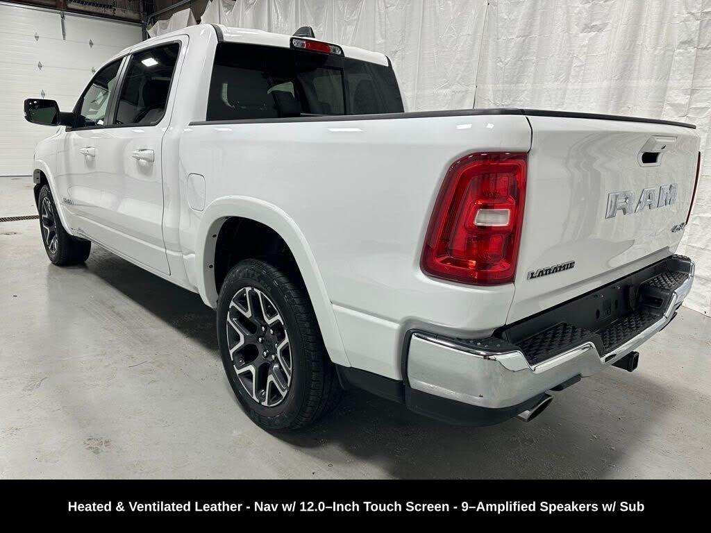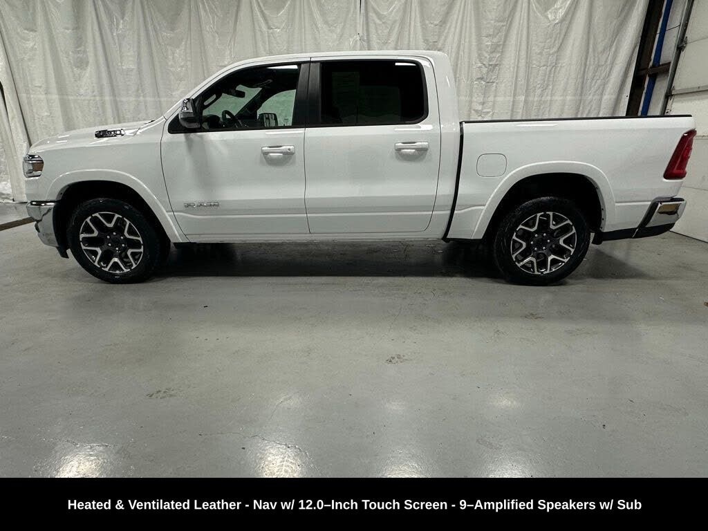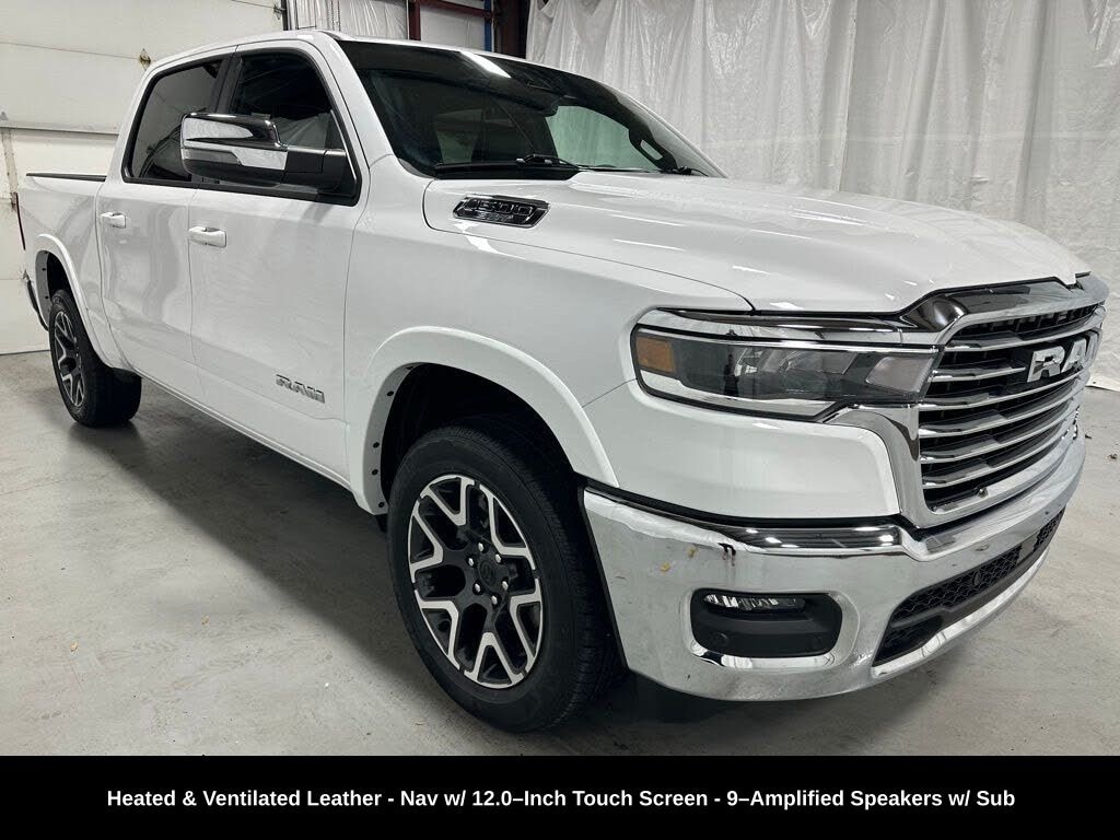 CARFAX One-Owner. ** Clean Carfax 1-Owner Accident Free History, ** Apple CarPlay/Android Auto, ** Adaptive Cruise Control, ** Blind Spot Monitor, ** Cross Traffic Alert, ** Alloy Wheels / Premium Wheels, ** Heated Seats, ** Cooled Seats, ** Bluetooth, Hands Free, ** Brake Assist, ** Camera Backup, ** Chrome Wheels / Premium Wheels / Custome Whwels, ** Cruise Control, ** Heated Steering Wheel, ** Keyless Entry, ** Lane Departure Warning, ** Leather Seats, ** LED Headlights, ** WiFi Hotspot, ** Navigation System, ** Premium Sound System / Premium Audio, ** Stability Control, ** Steering Wheel Controls, ** USB Port, ** Clean Carfax Accident Free History, ** One Owner, ** Power Drivers Seat, ** Power Passenger Seat, ** Heated Rear Seats, 4WD, 4X4, 3.0L I6 Hurricane SO Twin Turbo, 9â"Amplified Speakers with Subwoofer, Uconnect® 5 Nav with 12.0â"Inch Touch Screen Display, Ventilated Front Seats, 20â"Inch x 9.0â"Inch Premium Painted/Polished Wheels, Engine & Performance Engine: 3.0 L I-6 Hurricane Twin-Turbo (single-output) Horsepower: 420 hp @ 5,200 rpm Torque: 469 lb-ft @ 3,500 rpm Transmission: 8-speed automatic (8HP75) Drive System: Four-Wheel Drive (4Ã4) Fuel Economy (EPA est.) City: ~17 MPG Highway: ~24 MPG Combined: ~21 MPG Fuel Tank: ~33 gal (varies by box/option), 1500 Laramie Crew Cab 4WD, 4D Crew Cab, 3.0L I6, 8-Speed Automatic, 4WD, Bright White Clearcoat, Black Leather, GPS Navigation, Navigation System, Quick Order Package 21H Laramie.